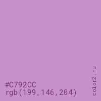 Цвет #C792CC в цветовой модели RGB обозначается тремя октетами (199, 146, 204) в десятичном формате и #C792CC в шестнадцатиричном (hex) формате, которые являются интенсивностью красного 199 (hex C7), интенсивность зелёного 146 (hex 92) и интенсивность синего 204 (hex CC).
