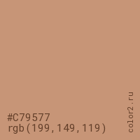 Цвет #C79577 в цветовой модели RGB обозначается тремя октетами (199, 149, 119) в десятичном формате и #C79577 в шестнадцатиричном (hex) формате, которые являются интенсивностью красного 199 (hex C7), интенсивность зелёного 149 (hex 95) и интенсивность синего 119 (hex 77).