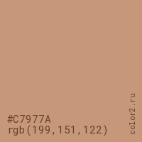Цвет RGB(199, 151, 122) в процентом отношении количества цвета состоит из 78% красного (red), 59.2% зелёного (green) и 47.8% синего (blue).