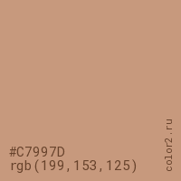 Цвет #C7997D в цветовой модели RGB обозначается тремя октетами (199, 153, 125) в десятичном формате и #C7997D в шестнадцатиричном (hex) формате, которые являются интенсивностью красного 199 (hex C7), интенсивность зелёного 153 (hex 99) и интенсивность синего 125 (hex 7D).
