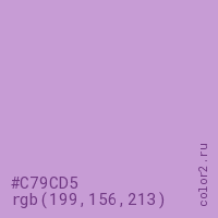 Цвет #C79CD5 в цветовой модели RGB обозначается тремя октетами (199, 156, 213) в десятичном формате и #C79CD5 в шестнадцатиричном (hex) формате, которые являются интенсивностью красного 199 (hex C7), интенсивность зелёного 156 (hex 9C) и интенсивность синего 213 (hex D5).