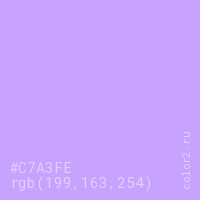 Цвет #C7A3FE в цветовой модели RGB обозначается тремя октетами (199, 163, 254) в десятичном формате и #C7A3FE в шестнадцатиричном (hex) формате, которые являются интенсивностью красного 199 (hex C7), интенсивность зелёного 163 (hex A3) и интенсивность синего 254 (hex FE).