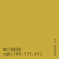 Цвет #C7AB3D в цветовой модели RGB обозначается тремя октетами (199, 171, 61) в десятичном формате и #C7AB3D в шестнадцатиричном (hex) формате, которые являются интенсивностью красного 199 (hex C7), интенсивность зелёного 171 (hex AB) и интенсивность синего 61 (hex 3D).