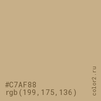 Цвет #C7AF88 в цветовой модели RGB обозначается тремя октетами (199, 175, 136) в десятичном формате и #C7AF88 в шестнадцатиричном (hex) формате, которые являются интенсивностью красного 199 (hex C7), интенсивность зелёного 175 (hex AF) и интенсивность синего 136 (hex 88).