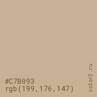 Цвет #C7B093 в цветовой модели RGB обозначается тремя октетами (199, 176, 147) в десятичном формате и #C7B093 в шестнадцатиричном (hex) формате, которые являются интенсивностью красного 199 (hex C7), интенсивность зелёного 176 (hex B0) и интенсивность синего 147 (hex 93).