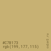 Цвет #C7B173 в цветовой модели RGB обозначается тремя октетами (199, 177, 115) в десятичном формате и #C7B173 в шестнадцатиричном (hex) формате, которые являются интенсивностью красного 199 (hex C7), интенсивность зелёного 177 (hex B1) и интенсивность синего 115 (hex 73).