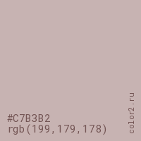 Цвет #C7B3B2 в цветовой модели RGB обозначается тремя октетами (199, 179, 178) в десятичном формате и #C7B3B2 в шестнадцатиричном (hex) формате, которые являются интенсивностью красного 199 (hex C7), интенсивность зелёного 179 (hex B3) и интенсивность синего 178 (hex B2).