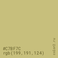 Цвет #C7BF7C в цветовой модели RGB обозначается тремя октетами (199, 191, 124) в десятичном формате и #C7BF7C в шестнадцатиричном (hex) формате, которые являются интенсивностью красного 199 (hex C7), интенсивность зелёного 191 (hex BF) и интенсивность синего 124 (hex 7C).