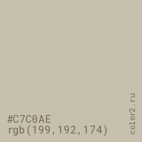 Цвет #C7C0AE в цветовой модели RGB обозначается тремя октетами (199, 192, 174) в десятичном формате и #C7C0AE в шестнадцатиричном (hex) формате, которые являются интенсивностью красного 199 (hex C7), интенсивность зелёного 192 (hex C0) и интенсивность синего 174 (hex AE).