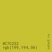 Цвет #C7C232 в цветовой модели RGB обозначается тремя октетами (199, 194, 50) в десятичном формате и #C7C232 в шестнадцатиричном (hex) формате, которые являются интенсивностью красного 199 (hex C7), интенсивность зелёного 194 (hex C2) и интенсивность синего 50 (hex 32).