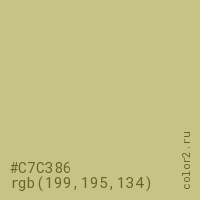 Цвет #C7C386 в цветовой модели RGB обозначается тремя октетами (199, 195, 134) в десятичном формате и #C7C386 в шестнадцатиричном (hex) формате, которые являются интенсивностью красного 199 (hex C7), интенсивность зелёного 195 (hex C3) и интенсивность синего 134 (hex 86).