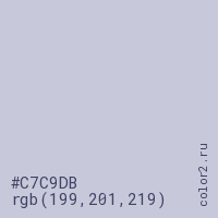 Цвет #C7C9DB в цветовой модели RGB обозначается тремя октетами (199, 201, 219) в десятичном формате и #C7C9DB в шестнадцатиричном (hex) формате, которые являются интенсивностью красного 199 (hex C7), интенсивность зелёного 201 (hex C9) и интенсивность синего 219 (hex DB).