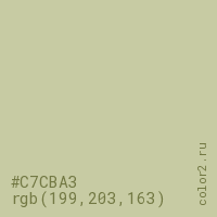 Цвет #C7CBA3 в цветовой модели RGB обозначается тремя октетами (199, 203, 163) в десятичном формате и #C7CBA3 в шестнадцатиричном (hex) формате, которые являются интенсивностью красного 199 (hex C7), интенсивность зелёного 203 (hex CB) и интенсивность синего 163 (hex A3).