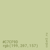 Цвет #C7CF9D в цветовой модели RGB обозначается тремя октетами (199, 207, 157) в десятичном формате и #C7CF9D в шестнадцатиричном (hex) формате, которые являются интенсивностью красного 199 (hex C7), интенсивность зелёного 207 (hex CF) и интенсивность синего 157 (hex 9D).