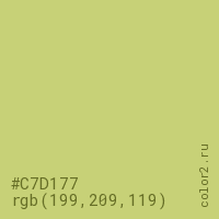 Цвет #C7D177 в цветовой модели RGB обозначается тремя октетами (199, 209, 119) в десятичном формате и #C7D177 в шестнадцатиричном (hex) формате, которые являются интенсивностью красного 199 (hex C7), интенсивность зелёного 209 (hex D1) и интенсивность синего 119 (hex 77).