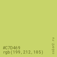 Цвет #C7D469 в цветовой модели RGB обозначается тремя октетами (199, 212, 105) в десятичном формате и #C7D469 в шестнадцатиричном (hex) формате, которые являются интенсивностью красного 199 (hex C7), интенсивность зелёного 212 (hex D4) и интенсивность синего 105 (hex 69).