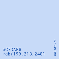 Цвет #C7DAF8 в цветовой модели RGB обозначается тремя октетами (199, 218, 248) в десятичном формате и #C7DAF8 в шестнадцатиричном (hex) формате, которые являются интенсивностью красного 199 (hex C7), интенсивность зелёного 218 (hex DA) и интенсивность синего 248 (hex F8).