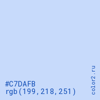 Цвет #C7DAFB в цветовой модели RGB обозначается тремя октетами (199, 218, 251) в десятичном формате и #C7DAFB в шестнадцатиричном (hex) формате, которые являются интенсивностью красного 199 (hex C7), интенсивность зелёного 218 (hex DA) и интенсивность синего 251 (hex FB).
