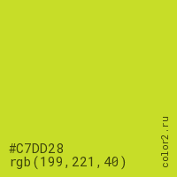 Цвет #C7DD28 в цветовой модели RGB обозначается тремя октетами (199, 221, 40) в десятичном формате и #C7DD28 в шестнадцатиричном (hex) формате, которые являются интенсивностью красного 199 (hex C7), интенсивность зелёного 221 (hex DD) и интенсивность синего 40 (hex 28).