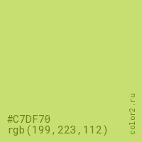 Цвет #C7DF70 в цветовой модели RGB обозначается тремя октетами (199, 223, 112) в десятичном формате и #C7DF70 в шестнадцатиричном (hex) формате, которые являются интенсивностью красного 199 (hex C7), интенсивность зелёного 223 (hex DF) и интенсивность синего 112 (hex 70).