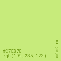 Цвет #C7EB7B в цветовой модели RGB обозначается тремя октетами (199, 235, 123) в десятичном формате и #C7EB7B в шестнадцатиричном (hex) формате, которые являются интенсивностью красного 199 (hex C7), интенсивность зелёного 235 (hex EB) и интенсивность синего 123 (hex 7B).