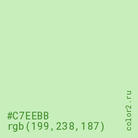 Цвет #C7EEBB в цветовой модели RGB обозначается тремя октетами (199, 238, 187) в десятичном формате и #C7EEBB в шестнадцатиричном (hex) формате, которые являются интенсивностью красного 199 (hex C7), интенсивность зелёного 238 (hex EE) и интенсивность синего 187 (hex BB).
