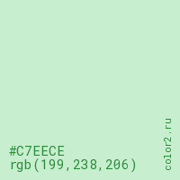 Цвет #C7EECE в цветовой модели RGB обозначается тремя октетами (199, 238, 206) в десятичном формате и #C7EECE в шестнадцатиричном (hex) формате, которые являются интенсивностью красного 199 (hex C7), интенсивность зелёного 238 (hex EE) и интенсивность синего 206 (hex CE).