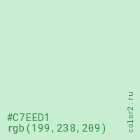 Цвет #C7EED1 в цветовой модели RGB обозначается тремя октетами (199, 238, 209) в десятичном формате и #C7EED1 в шестнадцатиричном (hex) формате, которые являются интенсивностью красного 199 (hex C7), интенсивность зелёного 238 (hex EE) и интенсивность синего 209 (hex D1).