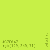 Цвет #C7F047 в цветовой модели RGB обозначается тремя октетами (199, 240, 71) в десятичном формате и #C7F047 в шестнадцатиричном (hex) формате, которые являются интенсивностью красного 199 (hex C7), интенсивность зелёного 240 (hex F0) и интенсивность синего 71 (hex 47).