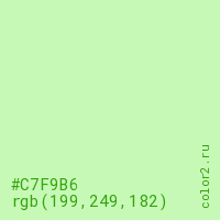 Цвет #C7F9B6 в цветовой модели RGB обозначается тремя октетами (199, 249, 182) в десятичном формате и #C7F9B6 в шестнадцатиричном (hex) формате, которые являются интенсивностью красного 199 (hex C7), интенсивность зелёного 249 (hex F9) и интенсивность синего 182 (hex B6).