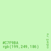 Цвет #C7F9BA в цветовой модели RGB обозначается тремя октетами (199, 249, 186) в десятичном формате и #C7F9BA в шестнадцатиричном (hex) формате, которые являются интенсивностью красного 199 (hex C7), интенсивность зелёного 249 (hex F9) и интенсивность синего 186 (hex BA).