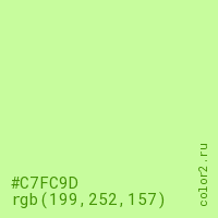 Цвет #C7FC9D в цветовой модели RGB обозначается тремя октетами (199, 252, 157) в десятичном формате и #C7FC9D в шестнадцатиричном (hex) формате, которые являются интенсивностью красного 199 (hex C7), интенсивность зелёного 252 (hex FC) и интенсивность синего 157 (hex 9D).