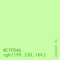 Цвет #C7FDA6 в цветовой модели RGB обозначается тремя октетами (199, 253, 166) в десятичном формате и #C7FDA6 в шестнадцатиричном (hex) формате, которые являются интенсивностью красного 199 (hex C7), интенсивность зелёного 253 (hex FD) и интенсивность синего 166 (hex A6).
