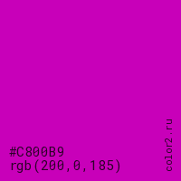 Цвет #C800B9 в цветовой модели RGB обозначается тремя октетами (200, 0, 185) в десятичном формате и #C800B9 в шестнадцатиричном (hex) формате, которые являются интенсивностью красного 200 (hex C8), интенсивность зелёного 0 (hex 00) и интенсивность синего 185 (hex B9).