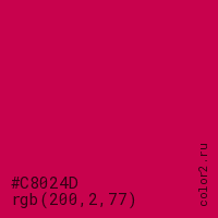 Цвет #C8024D в цветовой модели RGB обозначается тремя октетами (200, 2, 77) в десятичном формате и #C8024D в шестнадцатиричном (hex) формате, которые являются интенсивностью красного 200 (hex C8), интенсивность зелёного 2 (hex 02) и интенсивность синего 77 (hex 4D).