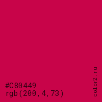 Цвет #C80449 в цветовой модели RGB обозначается тремя октетами (200, 4, 73) в десятичном формате и #C80449 в шестнадцатиричном (hex) формате, которые являются интенсивностью красного 200 (hex C8), интенсивность зелёного 4 (hex 04) и интенсивность синего 73 (hex 49).
