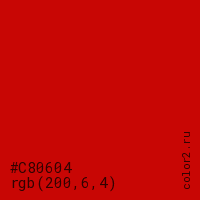 Цвет #C80604 в цветовой модели RGB обозначается тремя октетами (200, 6, 4) в десятичном формате и #C80604 в шестнадцатиричном (hex) формате, которые являются интенсивностью красного 200 (hex C8), интенсивность зелёного 6 (hex 06) и интенсивность синего 4 (hex 04).