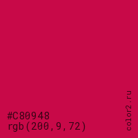 Цвет #C80948 в цветовой модели RGB обозначается тремя октетами (200, 9, 72) в десятичном формате и #C80948 в шестнадцатиричном (hex) формате, которые являются интенсивностью красного 200 (hex C8), интенсивность зелёного 9 (hex 09) и интенсивность синего 72 (hex 48).