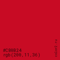 Цвет #C80B24 в цветовой модели RGB обозначается тремя октетами (200, 11, 36) в десятичном формате и #C80B24 в шестнадцатиричном (hex) формате, которые являются интенсивностью красного 200 (hex C8), интенсивность зелёного 11 (hex 0B) и интенсивность синего 36 (hex 24).