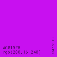 Цвет #C810F0 в цветовой модели RGB обозначается тремя октетами (200, 16, 240) в десятичном формате и #C810F0 в шестнадцатиричном (hex) формате, которые являются интенсивностью красного 200 (hex C8), интенсивность зелёного 16 (hex 10) и интенсивность синего 240 (hex F0).