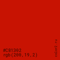 Цвет #C81302 в цветовой модели RGB обозначается тремя октетами (200, 19, 2) в десятичном формате и #C81302 в шестнадцатиричном (hex) формате, которые являются интенсивностью красного 200 (hex C8), интенсивность зелёного 19 (hex 13) и интенсивность синего 2 (hex 02).