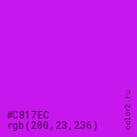 Цвет #C817EC в цветовой модели RGB обозначается тремя октетами (200, 23, 236) в десятичном формате и #C817EC в шестнадцатиричном (hex) формате, которые являются интенсивностью красного 200 (hex C8), интенсивность зелёного 23 (hex 17) и интенсивность синего 236 (hex EC).