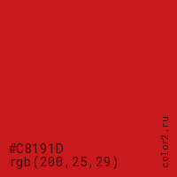 Цвет #C8191D в цветовой модели RGB обозначается тремя октетами (200, 25, 29) в десятичном формате и #C8191D в шестнадцатиричном (hex) формате, которые являются интенсивностью красного 200 (hex C8), интенсивность зелёного 25 (hex 19) и интенсивность синего 29 (hex 1D).