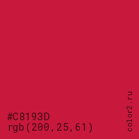 Цвет #C8193D в цветовой модели RGB обозначается тремя октетами (200, 25, 61) в десятичном формате и #C8193D в шестнадцатиричном (hex) формате, которые являются интенсивностью красного 200 (hex C8), интенсивность зелёного 25 (hex 19) и интенсивность синего 61 (hex 3D).