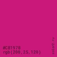 Цвет #C81978 в цветовой модели RGB обозначается тремя октетами (200, 25, 120) в десятичном формате и #C81978 в шестнадцатиричном (hex) формате, которые являются интенсивностью красного 200 (hex C8), интенсивность зелёного 25 (hex 19) и интенсивность синего 120 (hex 78).