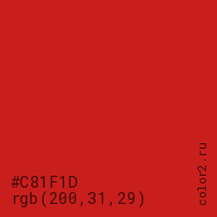 Цвет #C81F1D в цветовой модели RGB обозначается тремя октетами (200, 31, 29) в десятичном формате и #C81F1D в шестнадцатиричном (hex) формате, которые являются интенсивностью красного 200 (hex C8), интенсивность зелёного 31 (hex 1F) и интенсивность синего 29 (hex 1D).