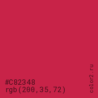 Цвет #C82348 в цветовой модели RGB обозначается тремя октетами (200, 35, 72) в десятичном формате и #C82348 в шестнадцатиричном (hex) формате, которые являются интенсивностью красного 200 (hex C8), интенсивность зелёного 35 (hex 23) и интенсивность синего 72 (hex 48).