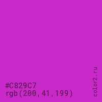 Цвет #C829C7 в цветовой модели RGB обозначается тремя октетами (200, 41, 199) в десятичном формате и #C829C7 в шестнадцатиричном (hex) формате, которые являются интенсивностью красного 200 (hex C8), интенсивность зелёного 41 (hex 29) и интенсивность синего 199 (hex C7).