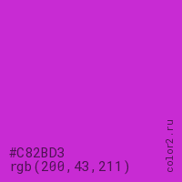 Цвет #C82BD3 в цветовой модели RGB обозначается тремя октетами (200, 43, 211) в десятичном формате и #C82BD3 в шестнадцатиричном (hex) формате, которые являются интенсивностью красного 200 (hex C8), интенсивность зелёного 43 (hex 2B) и интенсивность синего 211 (hex D3).