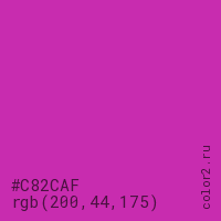 Цвет #C82CAF в цветовой модели RGB обозначается тремя октетами (200, 44, 175) в десятичном формате и #C82CAF в шестнадцатиричном (hex) формате, которые являются интенсивностью красного 200 (hex C8), интенсивность зелёного 44 (hex 2C) и интенсивность синего 175 (hex AF).